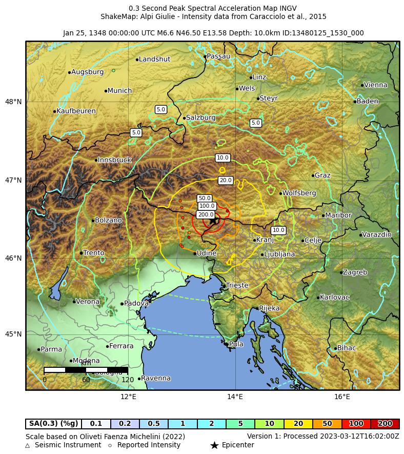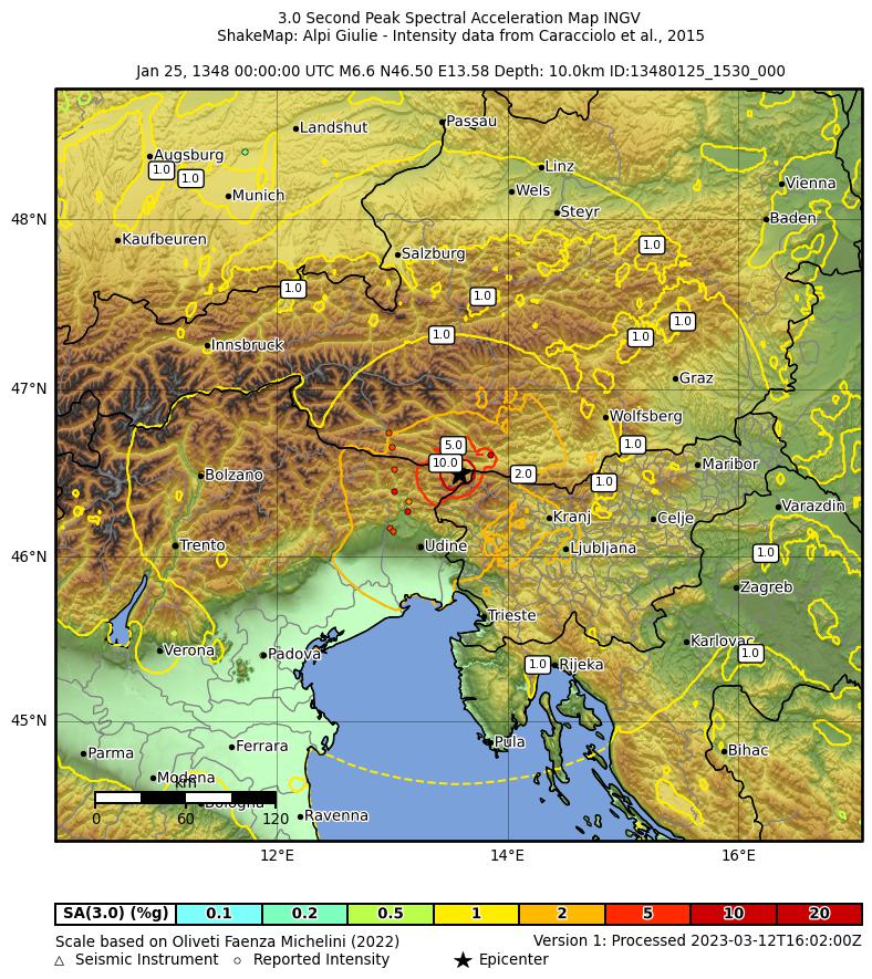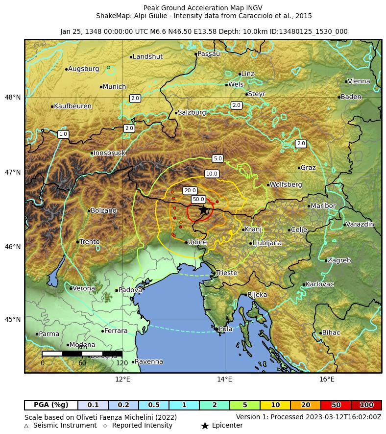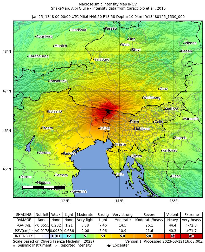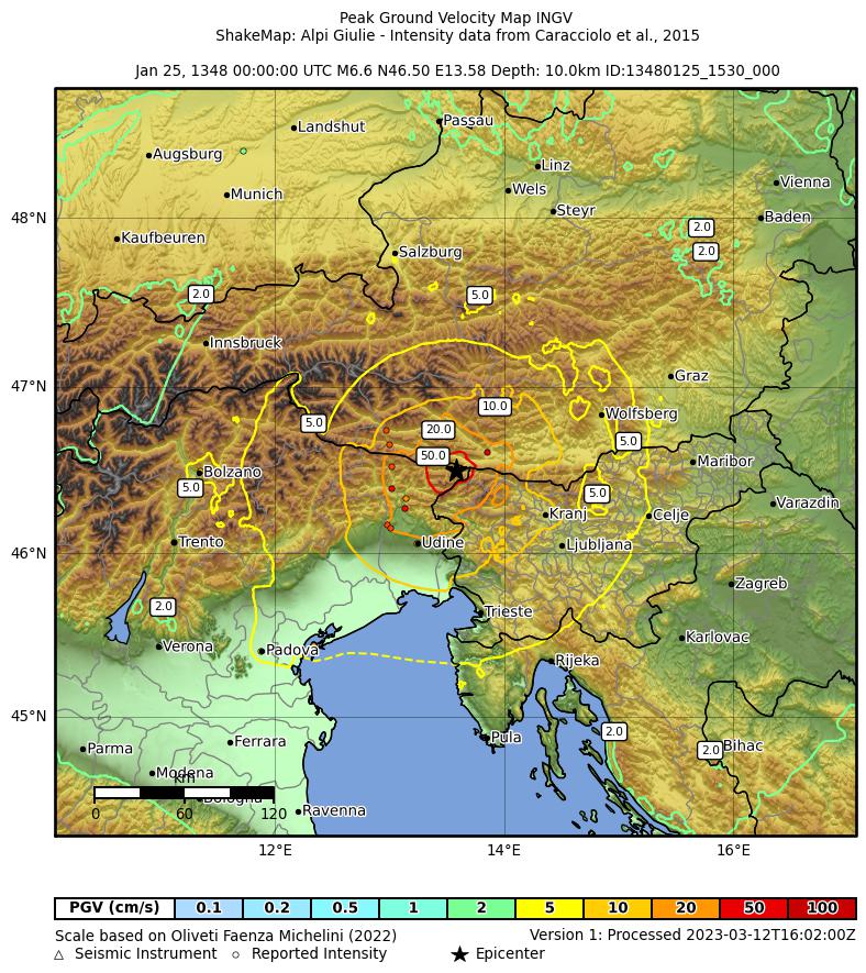 | CPTI11 | 1348-01-25 15:30 | 46.578 | 13.541 | -- | Mw 7.02 | 9-10 | CFTI4med | ||