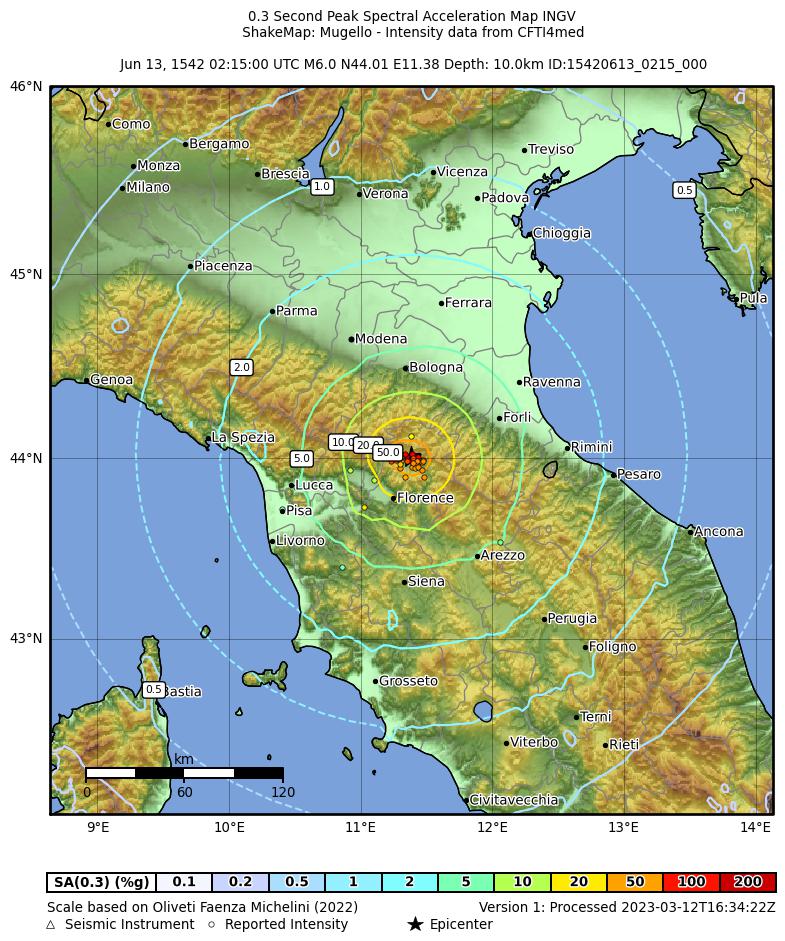 | CPTI11 | 1542-06-13 02:15 | 44.006 | 11.385 | -- | Mw 5.94 | 9 | CFTI4med | ||