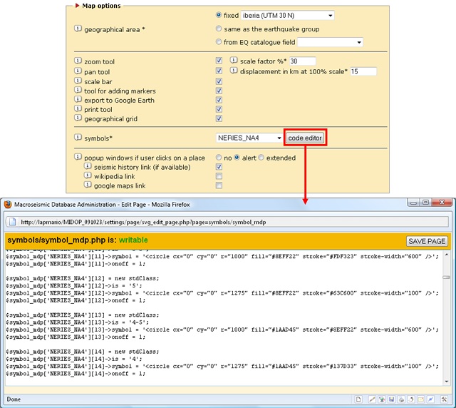 Available symbols used for plotting macroseismic intensities can be customized and new symbols can also be created by clicking the button “Edit” within the page “MDP map”: a popup window will open presenting a source code editor.