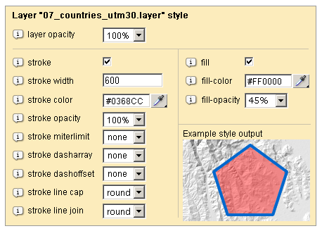 Styling the layer is possible within the dedicated control panel window (below) available both for layers in the “EQ map” and “MDP map” page. Through the visual interface can specify both the fill and the stroke style and the layer opacity (transparency).