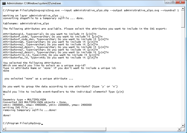 When asked, answer “n” to every question. Below an example output of the conversion of the shapefile called “administrative_alps.shp”: