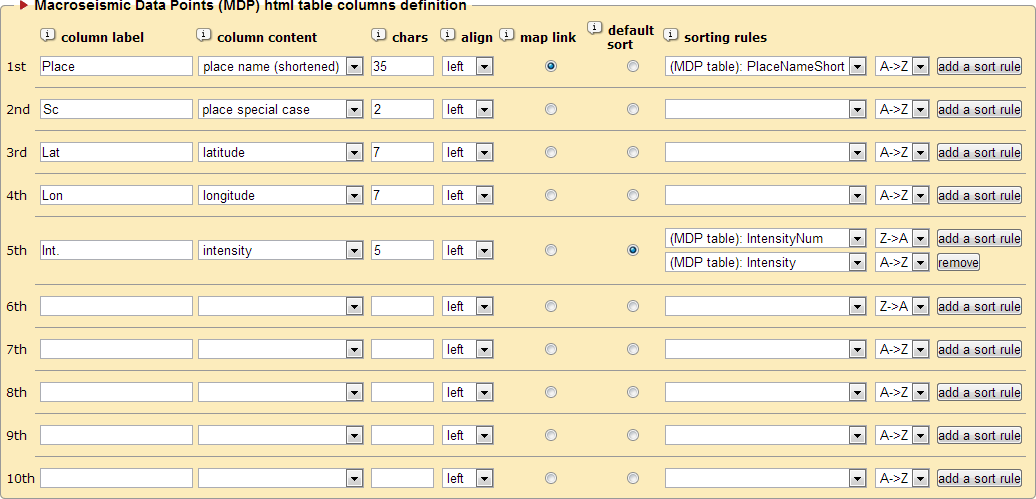 | Sorting rules | Define the rules for sorting the column content. The resulting sort of the column is the result of the sort of all the specified fields selected from the earthquake catalogue table, starting from the top to bottom. Click “add a sort rule” for adding a filed to the list. It is possible to specify a sort order for each selected field. |