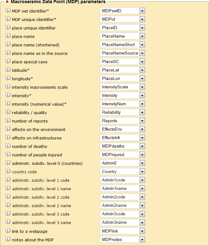 In this page you can define all the information contained in your Macroseismic Intensity Data table (as defined in tab.2). Each field existing in your table must be mapped to the corresponding MIDOP field. Fields with the “*” symbol are required. The following settings boxes are available: