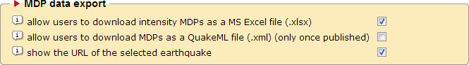 | MDP set identifier | Define the earthquake unique identifier. The identifier can be a number or a text but it must follow some rules: it cannot contain spaces, nor special character such "è, ì", accents, apostrophes, parenthesis, symbols (<, >, /, *, @, #, §, ...). Only the symbol "_" (underscore) is allowed. This parameter must be always set and it will be used by the system to create references between tables. This parameter will also be used for the dynamic file name creation of the final website files. |