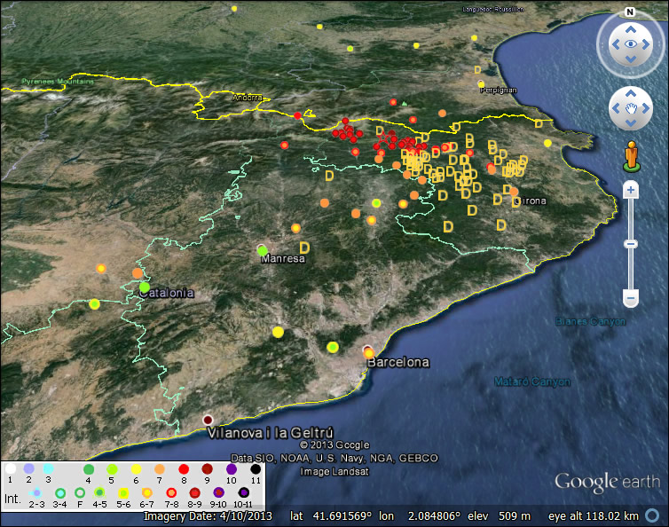 If “alert” or “extended” are selected, every intensity symbol rendered on the map can be clicked by the user. If “alert” only a simple system alert will appear with the place name and the intensity value, if “extended” a popup window will appear with information such as place name, the geographical coordinates and some other information (see below). |
