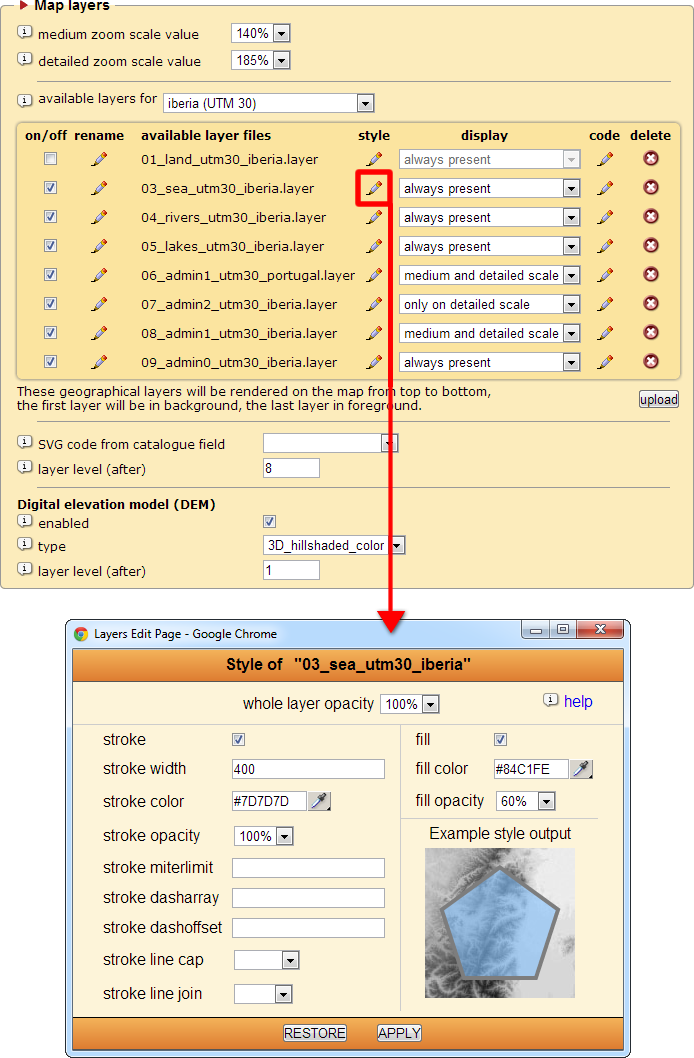 | Available layers for [covered area] | Manage which layers must be included with the generated maps. Built-in layers covers the following UTM zones: 28, ‘atlantic_islands’; 30, area 'iberia' or 'uk';31, area 'france';32, area 'italy';33, area 'eastern_europe' or ‘fennoscandia’;34, area 'aegean'. For further information on layers managements see chapter “Advanced customization”. |