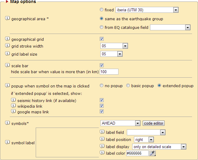 | Symbols | Select which set of symbols must be used for representing observed macroseismic intensities. By clicking 'edit' the administrator can modify the PHP/SVG file containing symbols for each set. |