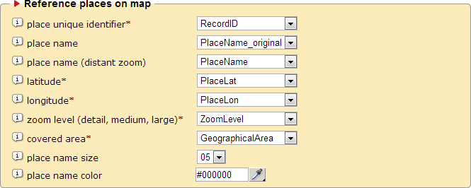 | Place name | Set the place name that will be plotted as a geographical reference on the map. |