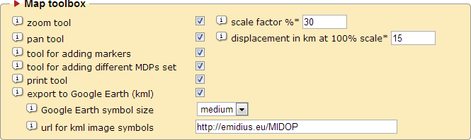 | URL for image symbols | Set the absolute site URL that will be used while generating Google Earth .kml files (MDP symbols and the legend images). Usually it is set as "http://emidius.eu/MIDOP". |