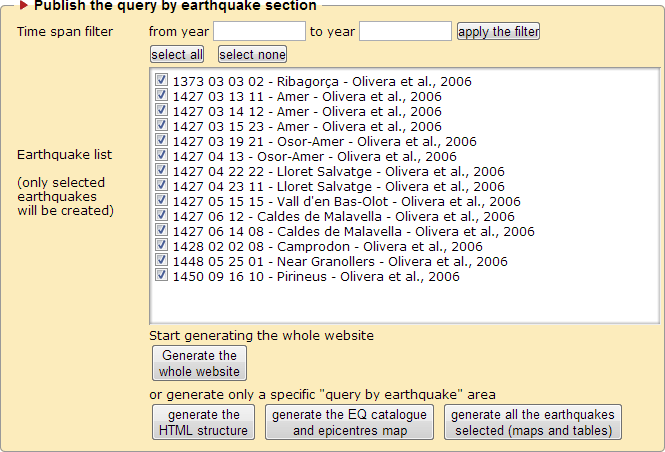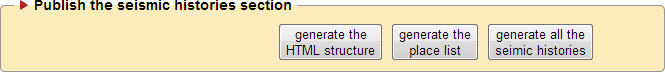 This page let you “publish” your website in its final version. Publishing a website mean that you will create a folder (MIDOP / PUBLISHED_SITES /) containing all the files required in order to load your website in Internet. There are two main publishing areas: one for the “query by earthquake” and the other for the “query by place”. Each part has been divided in publication steps in order to let you better control the publication process. If you repeat one step you will overwrite previously published files: this is useful for updating only those parts that are being updated.